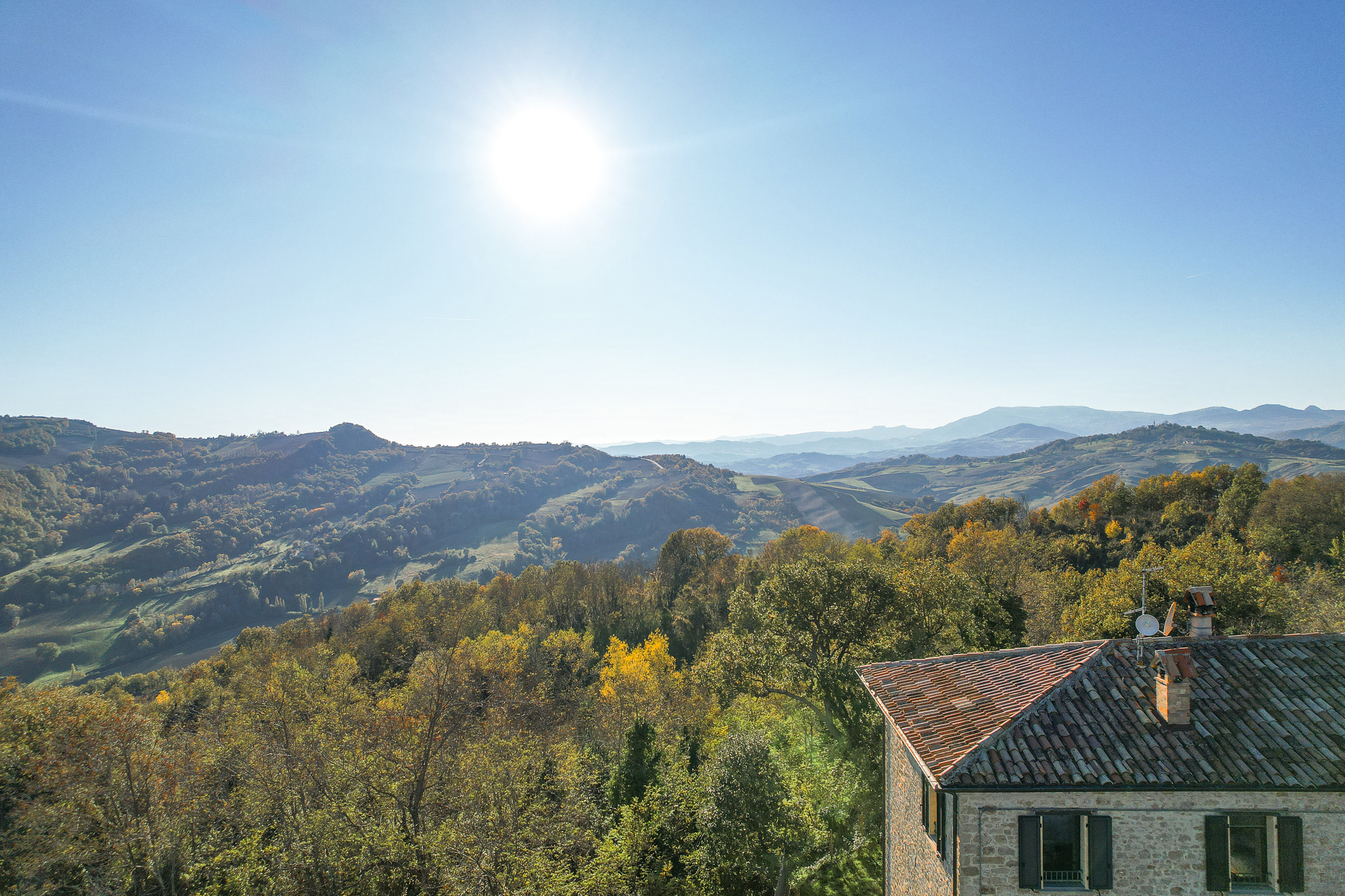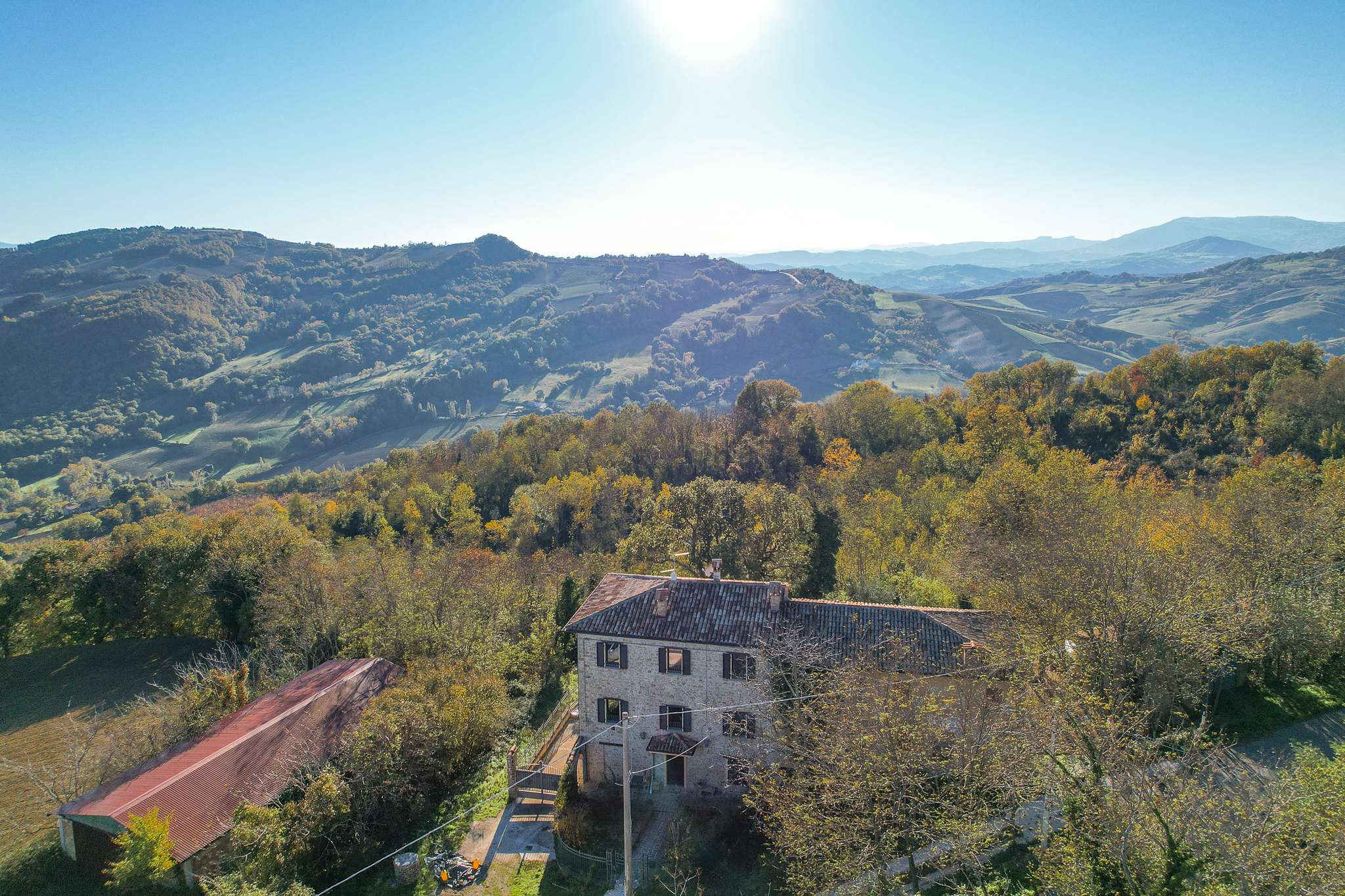 In Mercatino Conca, in a quiet area surrounded by greenery, with an asphalt road to the property and convenient connections to nearby villages, lies this complex of three buildings plus a two-story annex. Everything is surrounded by woods, agricultural land, and a wide panorama that ensures privacy and silence.