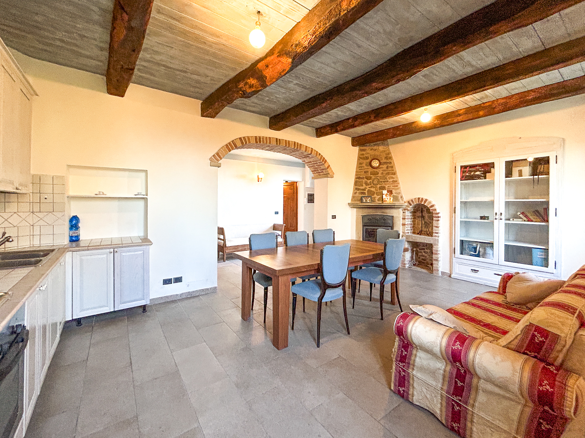 Inside there is a living room with a thermo-fireplace, a dining room, the kitchen, and a bathroom.