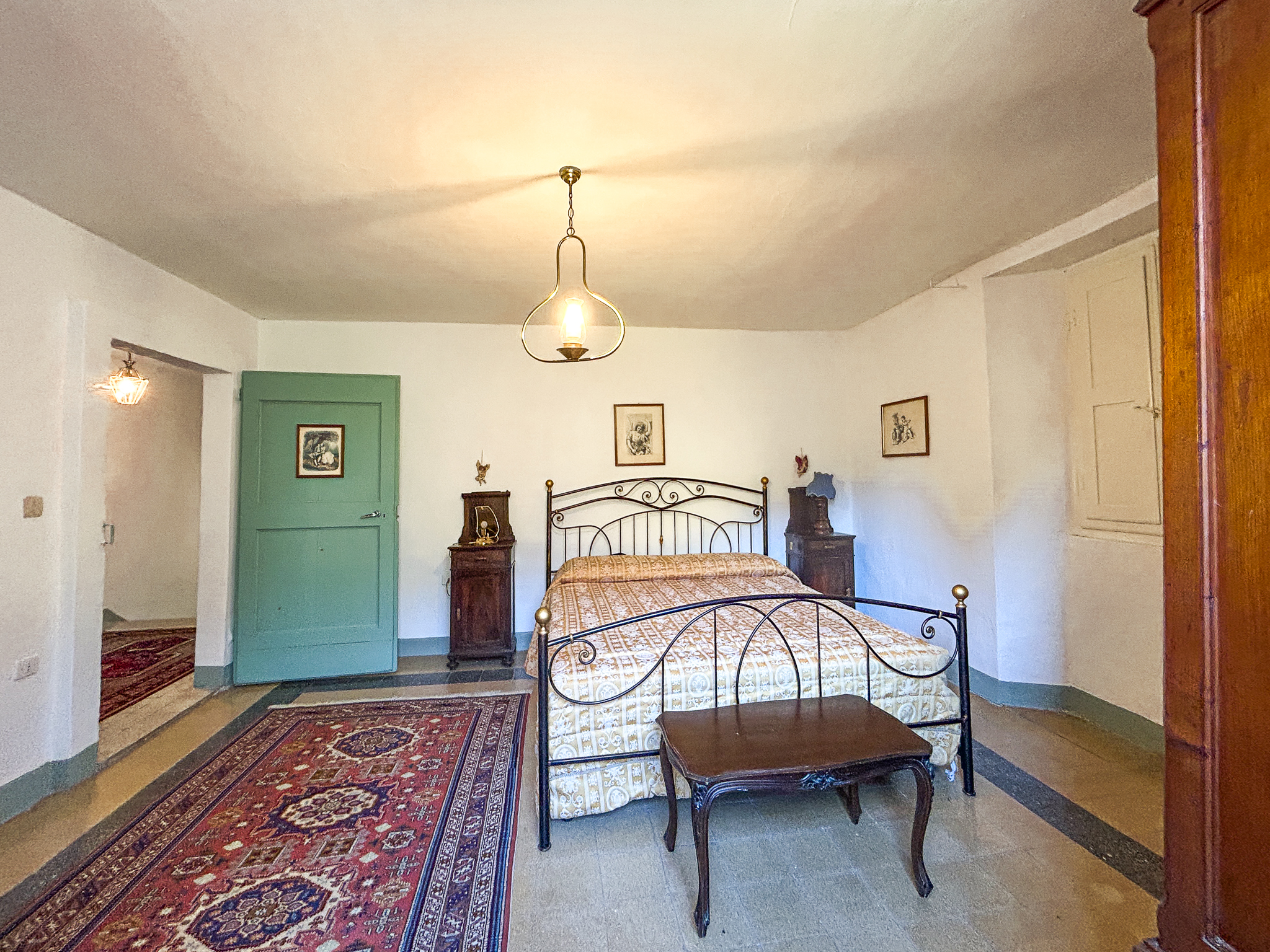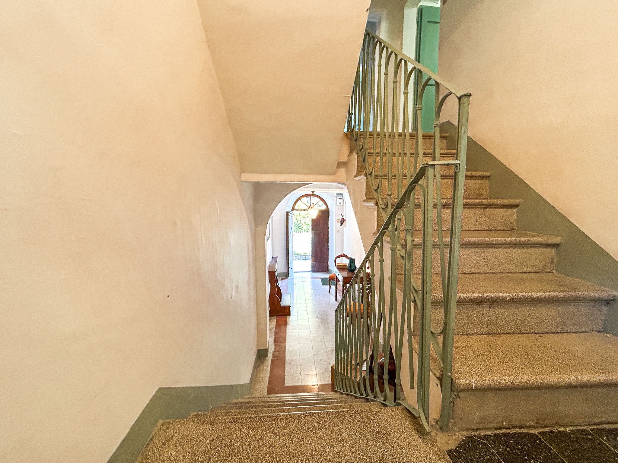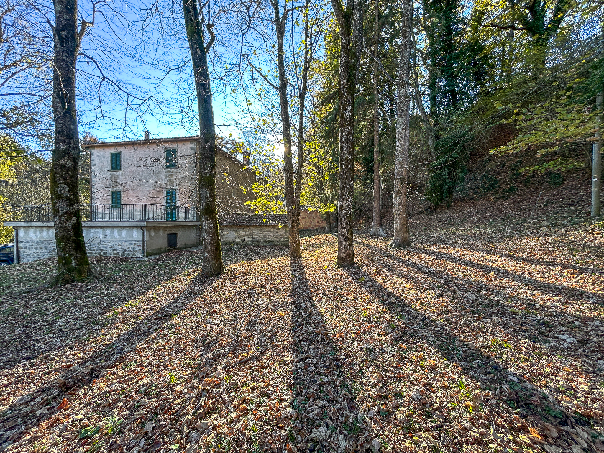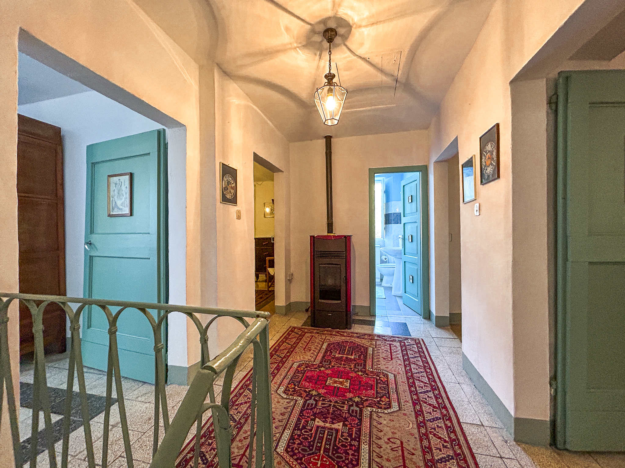 The historical part, about 300 square meters, is the oldest voice of the house: exposed stone, deep views, environments that seem to hold memories. Here the heating comes from a pellet stove and fireplaces, while the shutters, recently replaced, are made of metal.