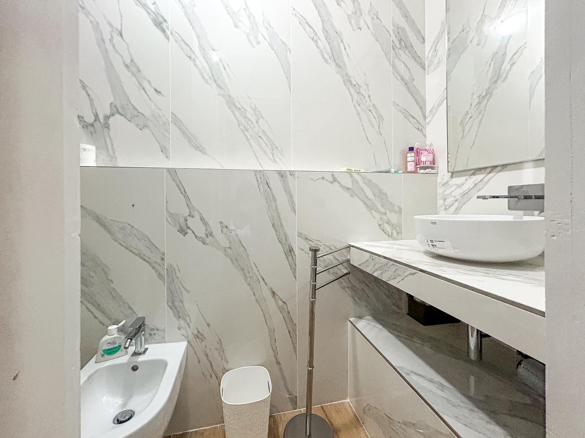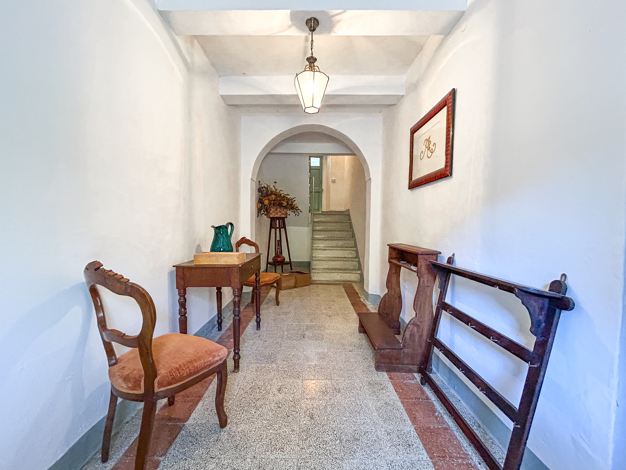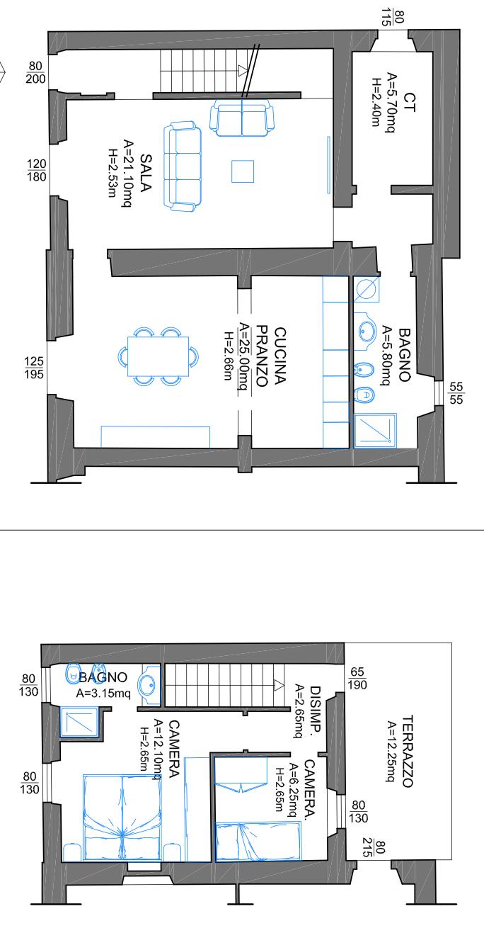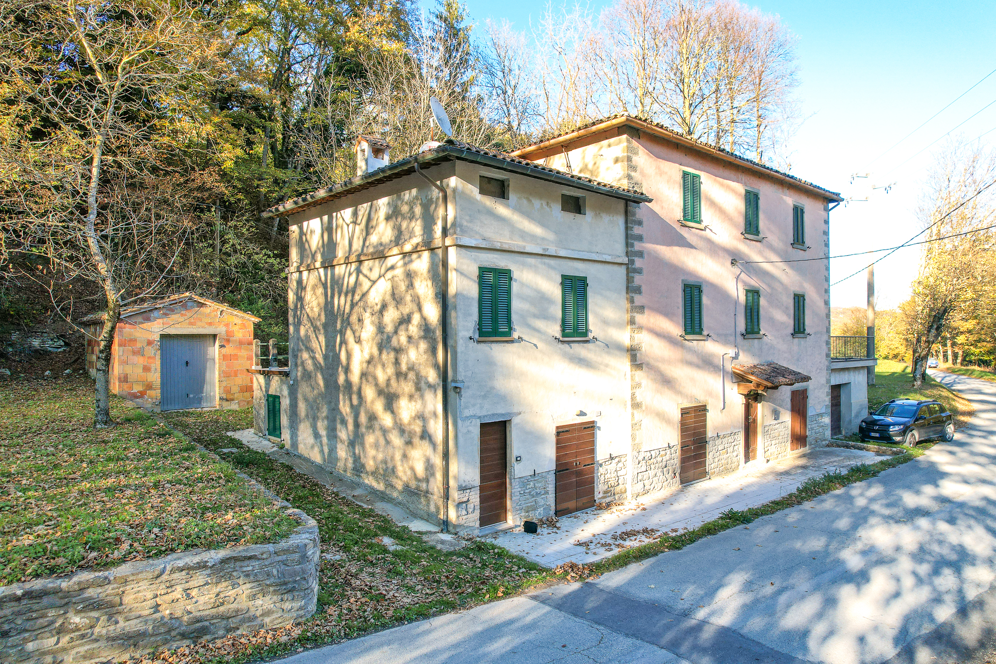 The historical part, about 300 square meters, is the oldest voice of the house: exposed stone, deep views, environments that seem to hold memories. Here the heating comes from a pellet stove and fireplaces, while the shutters, recently replaced, are made of metal.