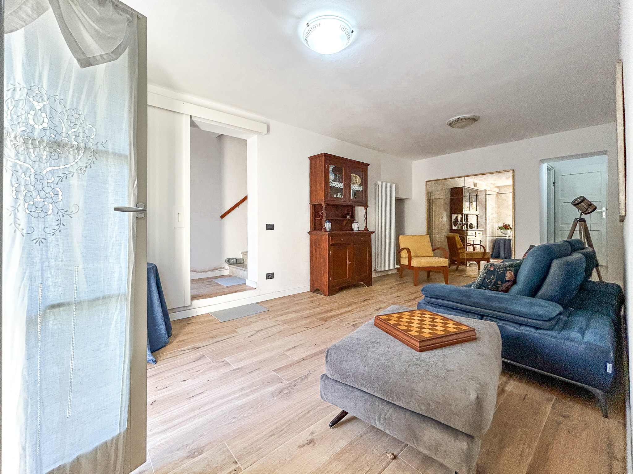 The smaller apartment, of about 110 square meters, was renovated in 2023: new systems, redone roof, reinforced floors, igloo, new interiors. The windows are made of wood, the energy class is B, the heat comes from a pellet boiler.
