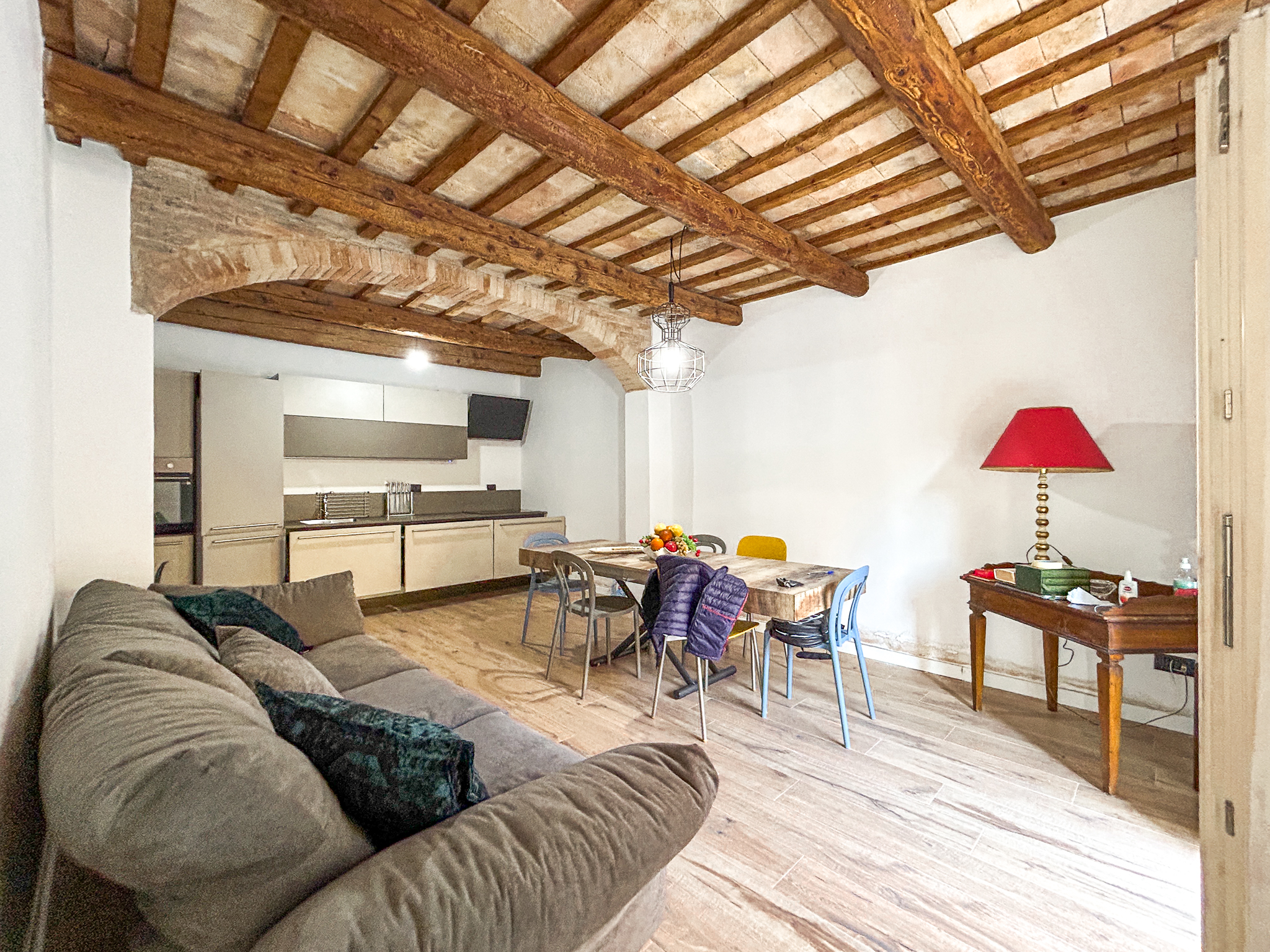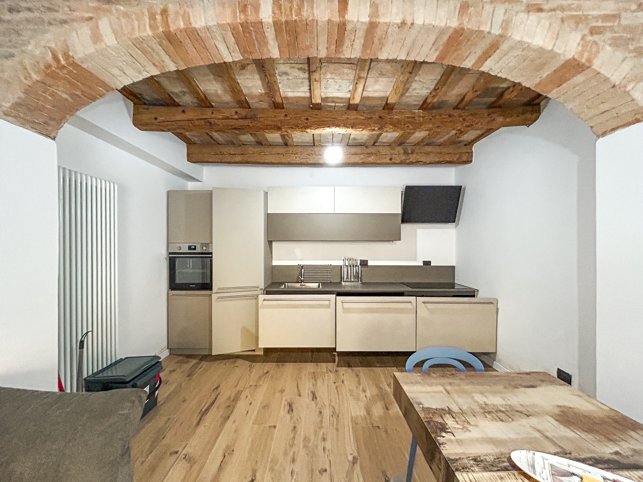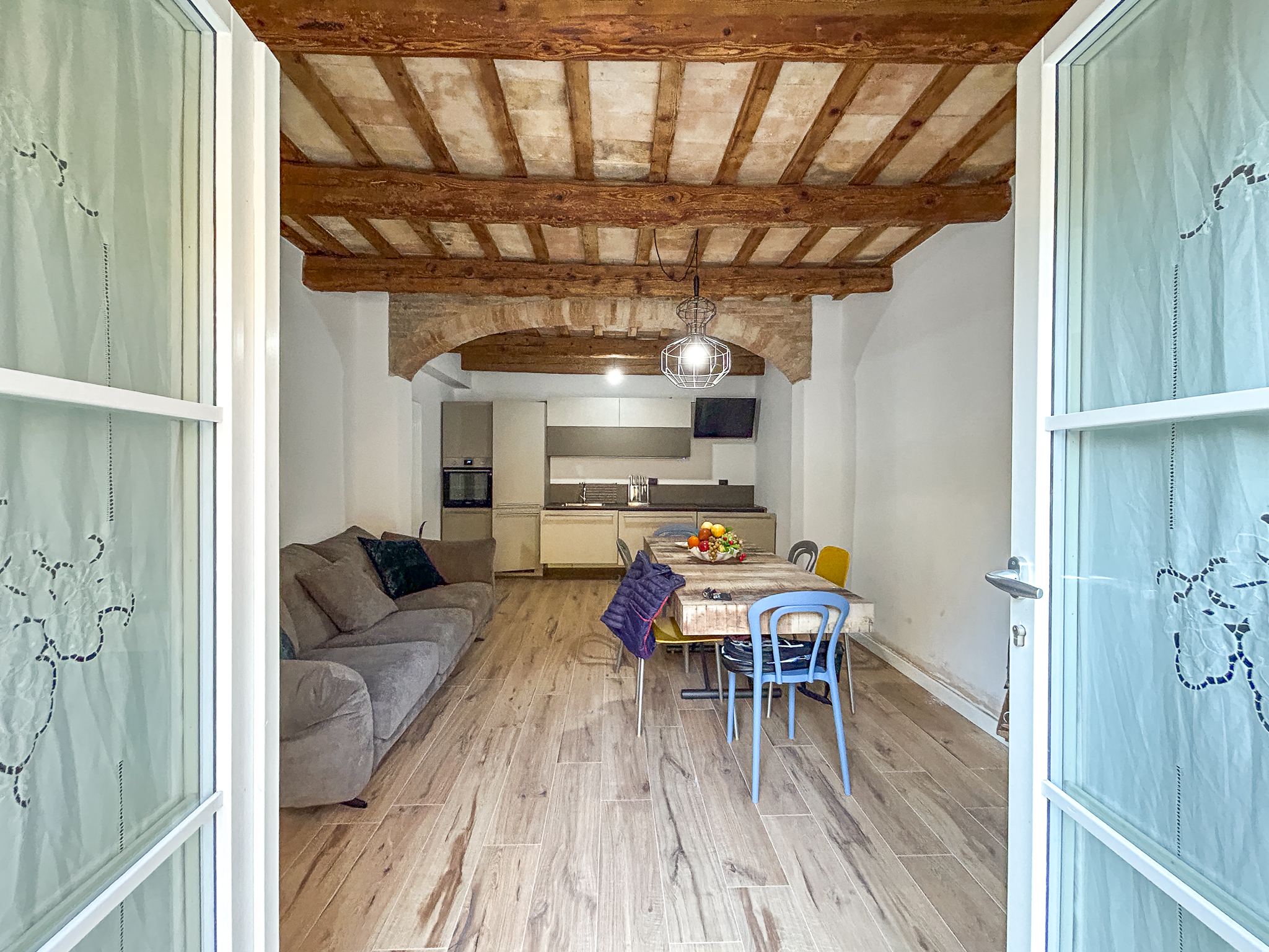 You enter and the ground floor welcomes you with a simple living room, a technical room, a bathroom with a window and shower, and a kitchen with wooden beams and radiators.