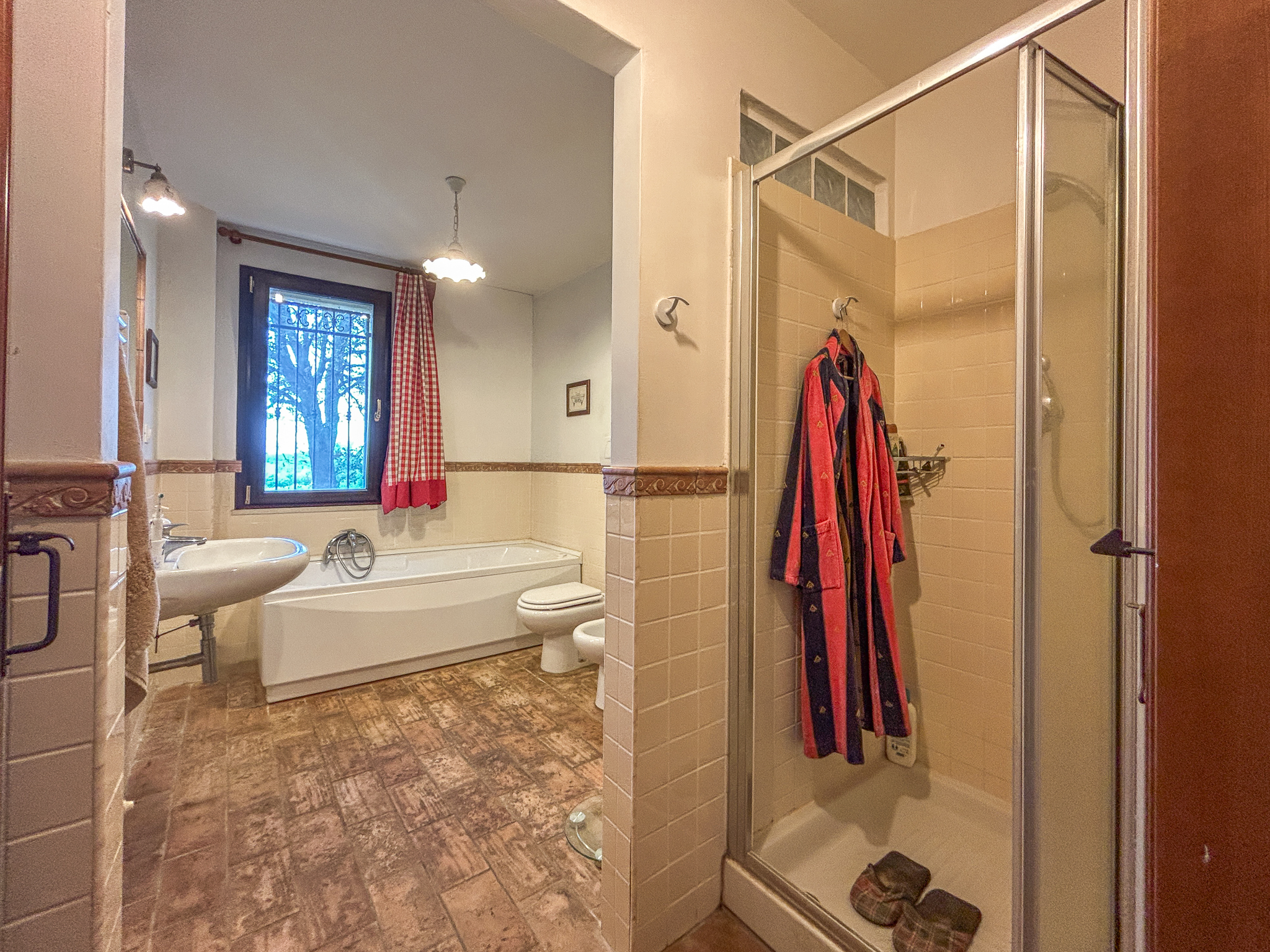 Inside, the terracotta and wood floors, the working fireplace and the handcrafted decorations of the bathrooms tell the authentic character of the house.