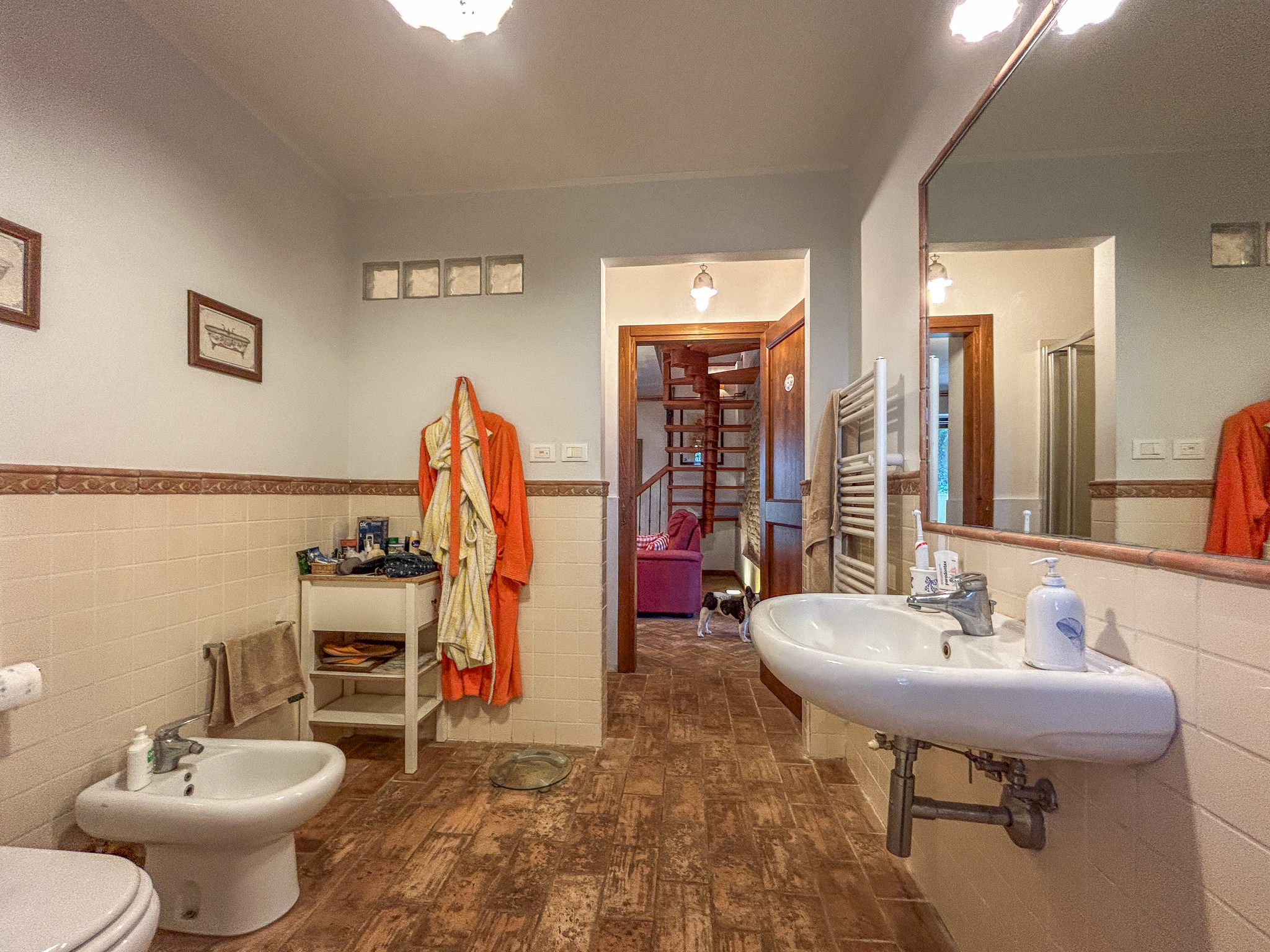 •Ground floor: living room with wooden staircase, a dining room now used as a bedroom, hand-decorated bathroom with shower and jacuzzi, large kitchen with access to the porch, study, and technical room with laundry.